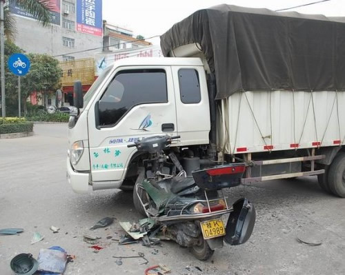 事故現(xiàn)場(chǎng)位于玉林市區(qū)一環(huán)北路州佩八運(yùn)公司前靠綠化帶的一條汽車專用道上,一輛車牌號(hào)為桂KKH018的白色貨車車身斜跨在第一條汽車專用道上,呈左轉(zhuǎn)彎姿勢(shì),左前輪處,一輛牌號(hào)為桂KD4898的摩托車直插在那里,摩托車車頭部位嚴(yán)重扭曲、變形,地上全部是零件碎片,貨車駕駛室左側(cè)車門有明顯的撞擊凹痕。路面上,三名大約十五六歲的男孩倒在地上,其中兩個(gè)自稱是乘客是男生倒地半分鐘之后自己爬了起來(lái),另一個(gè)男生多處部位出血,動(dòng)彈不得。