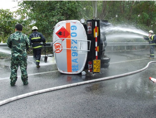 到達現(xiàn)場后,消防官兵立即利用可燃氣體偵檢儀檢測,確定揮發(fā)氣體濃度不在爆炸范圍內(nèi)。但油罐車側(cè)翻于道路中間并滑行近50米,車罐體由于與地面碰撞,造成大量柴油一路外溢,雖然柴油的危險性較低,但高速路上車流量大并且油罐車位于道路中間,一旦著火爆炸,將會給交通造成嚴重堵塞。當即,高速交警協(xié)同消防大隊、高速排障、高速路政迅速成立了現(xiàn)場指揮部。現(xiàn)場研究決定,交警部門實行交通管制,禁止任何車輛通行;排障隊負責調(diào)遣大型吊車進行吊車處理;消防大隊實施保護,同時開啟高壓水槍及水炮猛烈沖刷和稀釋公路上的柴油,并隨時應對起吊過程中可能發(fā)生的意外。為避免起吊過程中產(chǎn)生火花,民警立即劃定救援區(qū)域并關閉一切電子設備杜絕一切火源,消防官兵找來棉布、棉被墊附在纏繞的鋼絲繩下面,確保吊車過程中的安全實施操作。在多警聯(lián)動的共同努力下,油罐車終于被吊放在安全地帶并由掛車拖離現(xiàn)場,交通恢復正常。目前,事故原因正在進一步調(diào)查中。