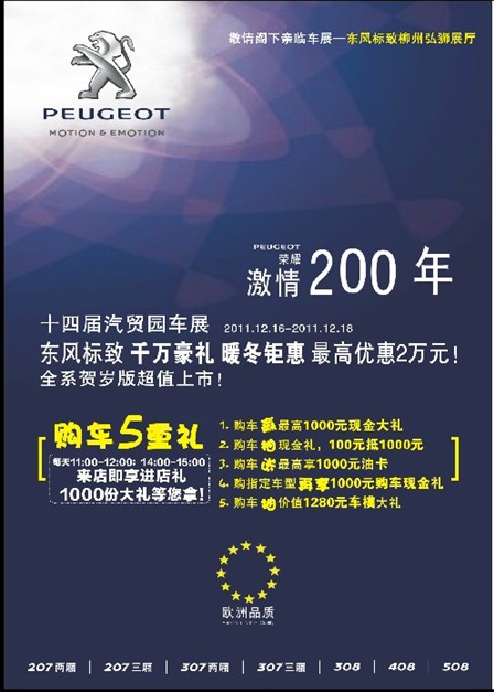 定于本月16-18日的汽貿(mào)車展,即將拉開序幕。此次車展東風(fēng)標致品牌207. 307 .408分別推出賀歲版車型,備受關(guān)注的308、508專為時尚、成功人士量身打造。此次活動是廠家直接支持,價格優(yōu)惠史無前例,全系最高優(yōu)惠2萬!現(xiàn)場精美禮品回饋,來店必有禮,購車還有機會贏車模大獎!