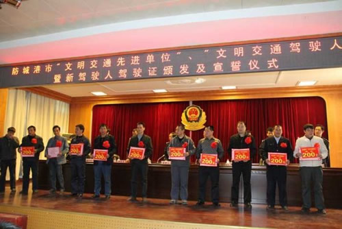 12月12日上午,防城港市道路交通安全工作聯(lián)席會(huì)議在市交警支隊(duì)舉行“文明交通先進(jìn)單位”、“文明交通駕駛?cè)恕北碚脙x式。市道路交通安全工作聯(lián)席會(huì)議共對(duì)全市評(píng)選出的5個(gè)“文明交通先進(jìn)單位”、 32名“文明交通駕駛?cè)恕庇枰员碚貌㈩C發(fā)證書和獎(jiǎng)金;此外,50名新駕駛?cè)思邪l(fā)放駕駛證及宣誓儀式也一并舉行。市道路交通安全工作聯(lián)席會(huì)議成員單位負(fù)責(zé)人、受表彰的“文明交通先進(jìn)單位”代表和“文明交通駕駛?cè)恕、各駕校工作人員近200人參加儀式(如圖)。