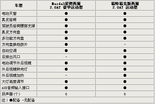 在舒適性配置方面,馬自達(dá)3星騁兩廂與?怂箖蓭渲昧穗妱(dòng)天窗、真皮座椅、真皮方向盤、雙區(qū)自動(dòng)空調(diào)等實(shí)用性與豪華型并存的配備。而馬自達(dá)3星騁配備了方向盤換擋撥片,大幅提升了駕駛樂趣。?怂巩(dāng)然也不甘落后,后排出風(fēng)口的優(yōu)勢(shì)體現(xiàn)出福特汽車對(duì)乘客舒適性的重視。