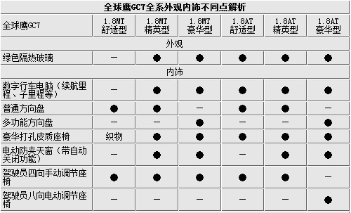 而在安全配置差異方面,泊車(chē)?yán)走_(dá)以及倒車(chē)?yán)走_(dá)沒(méi)有出現(xiàn)在最低配置車(chē)型上,而可視倒車(chē)系統(tǒng)也只在手動(dòng)豪華型、自動(dòng)精英型及自動(dòng)豪華型上出現(xiàn)。需要提一點(diǎn)的就是主副駕駛雙氣囊,吉利全球鷹GC7僅僅只有兩款豪華型把雙氣囊作為標(biāo)準(zhǔn)配置,其他車(chē)型都是選配部件,這對(duì)安全的作用有較大的影響。而B(niǎo)MBS爆胎監(jiān)測(cè)與安全控制系統(tǒng)也只在自動(dòng)擋最高配車(chē)型上能夠選配,安全配置有待加強(qiáng)。