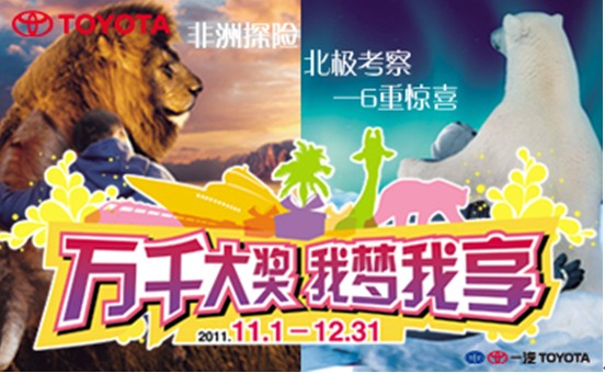 2011.11.1——2011.12.31期間,只要選購皇冠、銳志、RAV4、卡羅拉、花冠、威馳這6款車型之一,便可獲贈價值1000~2500元不等的購車禮包。凡購車成功者均可參加抽獎活動,幸運中獎?wù)哌可獲得價值2000~4999元不等的團圓飯禮劵、春節(jié)大禮包、西藏觀光行、香港迪士尼新年游覽之旅或搭乘豪華郵輪游覽日韓、東南亞的機會。另外,您還可以通過參與《時尚旅游》雜志的征稿活動,獲取成為明年4月北極之旅或非洲之旅特約報道員的機會。