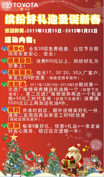 圣誕節(jié)會讓你想到什么?圣誕樹、圣誕老人、火雞、禮物、糖果……還是在已經(jīng)離春節(jié)不遠(yuǎn)了,要趕緊帶著您的家人買新車過新年呢?在猶豫周末的圣誕節(jié)要去感受圣誕氣氛還是趕緊去看車嗎?別擔(dān)心!南寧中達(dá)豐田在平安夜和圣誕節(jié)滿足您的全部愿望。