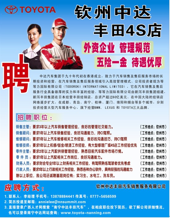 目前,欽州分公司、武鳴分公司即將開業(yè),現(xiàn)面向社會廣納賢才,我們將提供良好的工作環(huán)境、高標(biāo)準(zhǔn)的培訓(xùn)、廣闊的發(fā)展空間和富有競爭力的薪酬福利。一流的企業(yè)期待一流的人才: