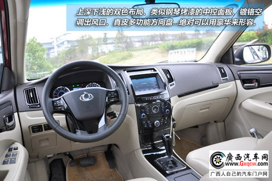 來(lái)到車(chē)內(nèi),上深下淺的雙色布局、類(lèi)似鋼琴烤漆的中控面板、鍍鉻空調(diào)出風(fēng)口、真皮多功能方向盤(pán)...絕對(duì)可以用豪華來(lái)形容。4幅式多功能方向盤(pán)很粗壯,3點(diǎn)、9點(diǎn)處同樣帶有類(lèi)似鋼琴烤漆的工藝處理,而多功能按鍵功能豐富、阻尼感不錯(cuò)。操作便利,很容易上手。中控臺(tái)上的大屏幕是亮點(diǎn)所在,而且它還是觸摸式設(shè)計(jì)。娛樂(lè)系統(tǒng)、倒車(chē)影像以及導(dǎo)航顯示等。