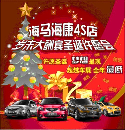近日,編輯從海馬?凳昀吓频戢@悉。一年一度的海馬?凳フQ大優(yōu)惠許愿活動正在火爆的進行之中,截至日前為止,已有超過100名意向客戶進店并填寫了圣誕許愿卡!想要購車的您還在等什么,趕快參加海馬海康的“圣誕節(jié)歡樂購車,歲末大酬賓活動”。