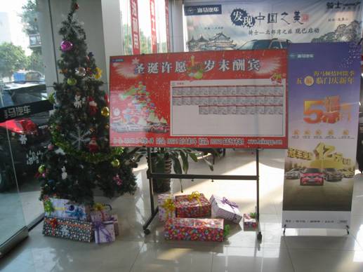 為了更全面的答謝新老客戶對(duì)南寧海康這一年以來的支持,本公司都將滿足在“圣誕樂購會(huì)”活動(dòng)中許下了圣誕愿望的客戶!截至日前為止,已有超過30名客戶都滿足了自己心儀已久的圣誕愿望!除此之外,凡于圣誕節(jié)當(dāng)天到店成功購買海馬汽車的客戶,還將獲得南寧?禋q末折上折的大幅優(yōu)惠!絕對(duì)另您逞心如意,讓你輕輕松松的購到您心儀已久的愛車,相信南寧?,這里絕對(duì)有一款汽車適合你!詳情可咨詢海馬?蛋咨4S店(0771—4922218,0771—4922219)