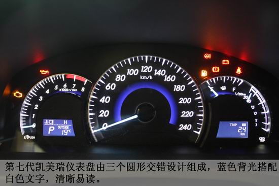 儀表盤采用三個(gè)圓弧形交錯(cuò)設(shè)計(jì),藍(lán)色背光搭配白色文字,清晰易讀。