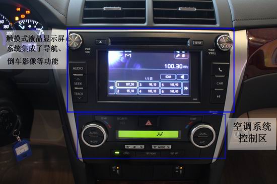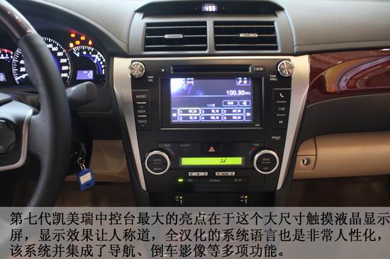 第七代凱美瑞(參數(shù)配置 圖庫)中控臺最大的亮點(diǎn)在于這個(gè)大尺寸觸摸式液晶顯示屏,該系統(tǒng)集成了導(dǎo)航、倒車影像等多項(xiàng)功能。下面是空調(diào)系統(tǒng)控制區(qū)。