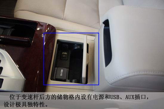 位于變速桿后方的儲物格內(nèi)設(shè)有電源和USB、AUX插口,設(shè)計(jì)極具獨(dú)特性。