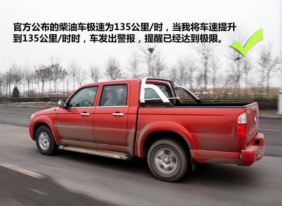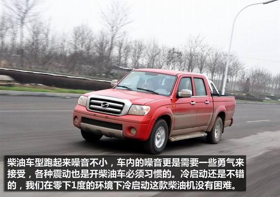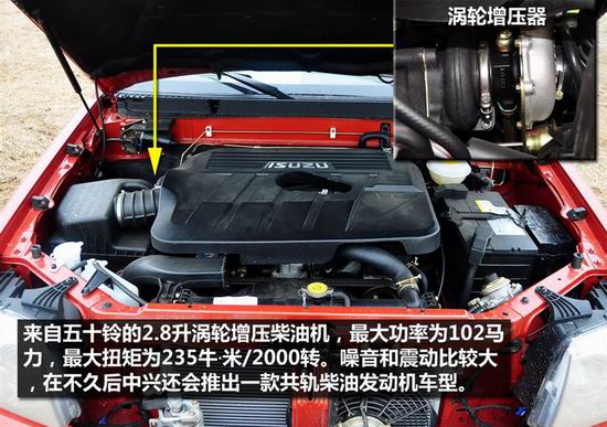 相比之下,柴油發(fā)動(dòng)機(jī)對(duì)于皮卡來說才是真正的好伙伴,目前中興的銷量也顯示柴油車型占了總銷量的一多半比例,柴油車好拉貨、省油。目前市場(chǎng)上銷售的機(jī)型為4JBITI,2.8升渦輪增壓柴油發(fā)動(dòng)機(jī),最大功率為102馬力,最大扭矩為235牛·米/2000轉(zhuǎn)。低速扭矩比汽油機(jī)好很多,如果是在拉貨起步或者是上大坡的時(shí)候會(huì)格外明顯,但是震動(dòng)和噪音也是汽油發(fā)動(dòng)機(jī)的倍數(shù)。官方公布的極速為135公里/時(shí),比汽油發(fā)動(dòng)機(jī)低了10公里/時(shí),出于對(duì)柴油發(fā)動(dòng)機(jī)極限狀態(tài)下的保護(hù),在達(dá)到135公里/時(shí)的時(shí)候會(huì)發(fā)出報(bào)警提示。廠商表示在不久的未來還會(huì)推出一款采用共軌技術(shù)的柴油發(fā)動(dòng)機(jī),噪音和振動(dòng)方面很改善很多。