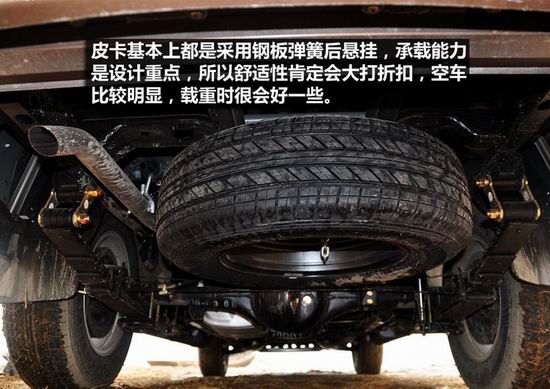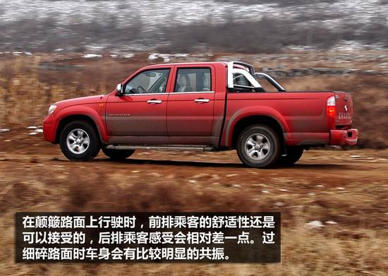 對(duì)于皮卡來說,其實(shí)都沒必要描寫舒適性,買這車基本上就是為了拉貨的,后面的鋼板彈簧只要不把貨物巔飛就好了。威虎F1后面的鋼板彈簧調(diào)教的不算特別硬,除了過減速帶的時(shí)候后座乘客屁股會(huì)短暫離開座位,對(duì)于細(xì)碎路面的過濾還是可以忍受的,只是共振很大。嗨,不多言了,能拉貨就行了。跑高速穩(wěn)定性很一般,只有1.6噸的車身加上較硬的“板兒簧”,過起伏路的時(shí)候比較飄,還好很少人會(huì)把皮卡開得這么快。
