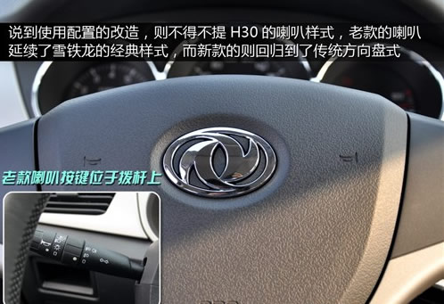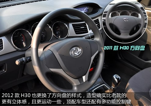 2012款H30中控方面的另一變化重點就是方向盤的造型,老款的方向盤樣式與標致車型的樣式十分相似,而新款方向盤的造型則更具體有立體感和運動感,另外在方向盤上還發(fā)現(xiàn)了新款H30變化的一大亮點,就是喇叭的位置回歸于傳統(tǒng)樣式,老款置于撥桿上的喇叭按鍵需要相當長的適應(yīng)時間,而樣式的“回歸”也是我們樂于看到的變化。
