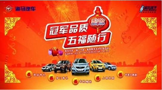 春節(jié)將至,編輯從海馬?4S店了解到。南寧?禐榱嘶仞亸V大老客戶多年來對海馬海康的支持,特于除夕前全面開展新春送福大優(yōu)惠活動,本次優(yōu)惠活動截止于元月23日。各位親愛的老客戶凡于活動期間內(nèi)介紹親朋好友成功購車者,即可獲得海馬?4S店為您奉上的1000元裝飾精品,新客戶成功購車者最高可享1.8萬元優(yōu)惠。本次新春送福大優(yōu)惠是南寧海康首次在“五福隨行”活動中額外推出,可謂優(yōu)惠不斷,好禮重重,您還在等什么?趁新春佳節(jié)來臨之際到南寧?颠x中一部適合自己的汽車。南寧海康歡迎您的光臨。詳情可咨詢海馬汽車南寧?4S店(0771-4885118,0771-4922218)。