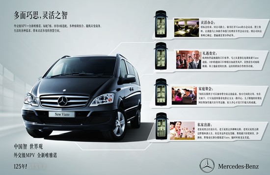 梅賽德斯—奔馳豪華商務(wù)車唯雅諾以超大的空間、同級(jí)最長(zhǎng)的3200mm的軸距為頂級(jí)商務(wù)用戶融造了一個(gè)舒適寬敞的內(nèi)部空間,同時(shí)豪華MPV中獨(dú)特的滑軌系統(tǒng)和面對(duì)面座椅設(shè)計(jì),使得車中最重要的貴賓能夠輕松自如的享受車內(nèi)交談,辦公及休息空間。