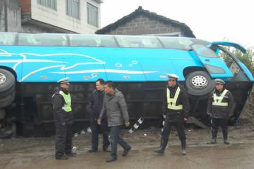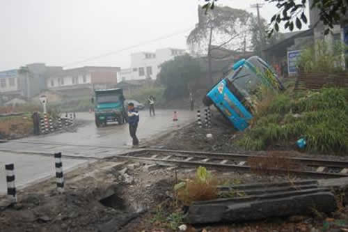 元月14日清晨6時許,一輛從廣東東莞發(fā)往忻城縣搭乘農(nóng)民工的大客車在途徑S323線大村鐵道口時沖出路面后側(cè)翻,造成17人受傷,其中5人重傷。