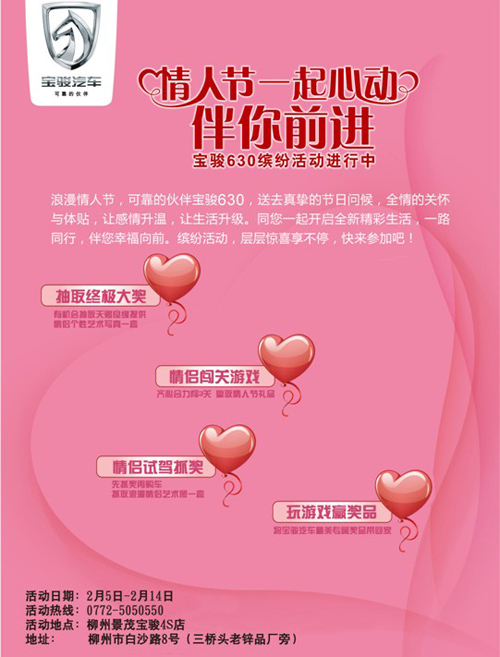 快樂活動四: 情人節(jié)活動期間,將推出寶駿630特價車一臺,還有更多情人節(jié)購車禮包贈送,機(jī)會難得,不要錯過哦!