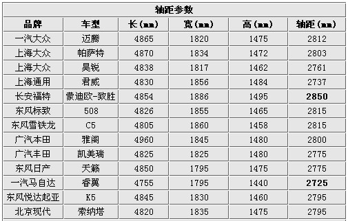 13款車(chē)型中,軸距最大的是蒙迪歐-致勝,能保證有寬大的空間;新邁騰和新帕薩特都經(jīng)過(guò)加長(zhǎng)的車(chē)型,滿(mǎn)足對(duì)空間的需求,尤其是邁騰解決上代車(chē)型的短板,昊銳相對(duì)來(lái)說(shuō)小些,保持原有設(shè)計(jì);君威的軸距參數(shù)并不突出,是因?yàn)樗途揭颉敖M合拳”所以只能讓位;標(biāo)致集團(tuán)的508和C5使用相同的平臺(tái),軸距參數(shù)比較客觀,但是由于后懸短所以不要對(duì)乘坐空間抱太多期望;雅閣就是號(hào)稱(chēng)自己是越級(jí)之作,超大的空間確實(shí)很實(shí)用;新凱美瑞軸距沒(méi)有變化,但是采用了后座和前排座位位移增加了些空間;天籟的乘坐空間在軸距就是銷(xiāo)量的今天只能說(shuō)基本夠用;睿翼不但軸距最短而且也是本場(chǎng)最靈活的中型車(chē),車(chē)長(zhǎng)僅4.7米;誕生同集團(tuán)的K5和索八使用相同的平臺(tái),但是K5長(zhǎng)度更大,主要是外形設(shè)計(jì)增加的長(zhǎng)度,2795的軸距能保證空間舒適性。