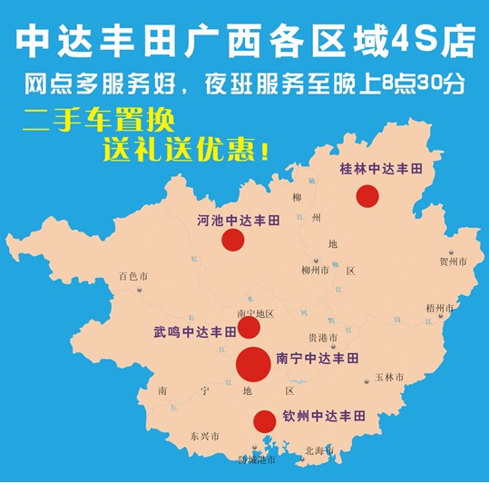 網(wǎng)點(diǎn)多服務(wù)好,十一年老店值得信賴!買車、售后服務(wù)就到金牌店南寧中達(dá)豐田,放心。