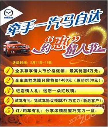 車有價,愛無價,浪漫情人節(jié),情牽一汽馬自達,共同體驗駕乘之愛,甜蜜之旅。鑫廣達一汽馬自達4S店全體員工預(yù)祝全天下的有情人終成眷屬!