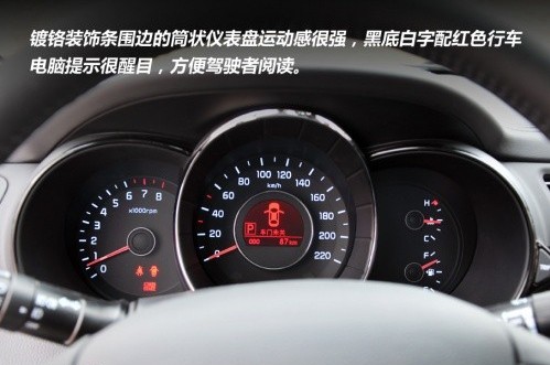 三幅式多功能方向盤尺寸適中,手感也比較舒適,炮筒式儀表盤同樣有鍍鉻裝飾,黑底白字的設(shè)計(jì)很醒目,中央紅色的行車電腦顯示屏涵蓋了瞬時(shí)油耗、檔位提示、行駛里程等功能。