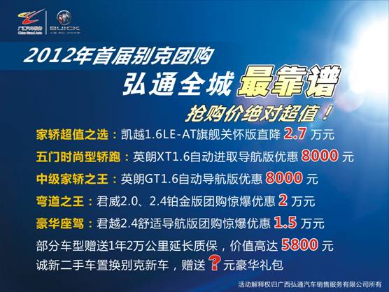 據(jù)編輯走訪獲悉,安吉別克2月精彩活動一波接一波,英朗愛試駕和情人節(jié)主題活動可謂是精彩連篇。但好戲在后頭,2月壓軸大戲《2012年別克首屆團購會》將于2月18日在弘通別克4S店上演。