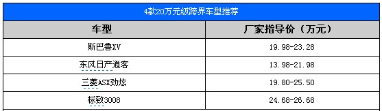 在國內(nèi)汽車市場中,SUV車型占據(jù)了很大的比例,這就說明人們對于高視野、高通過性、高實用性車型的需求,至少是心理需求,而城市SUV的崛起也迎合了人們多公路駕駛的客觀環(huán)境。但是隨著寶馬等車企帶領起來的跨界風潮,越來越多的CROSS車型開始大行其道,與SUV車型相當?shù)膶嵱眯院屯ㄟ^性,又兼具轎車的外觀和舒適性,跨界車型隨即成為大多數(shù)年輕人的首選車型。隨著斯巴魯XV在近期的上市,我們就為大家推薦4款20萬元級的跨界車型,希望對您的購車有所幫助。