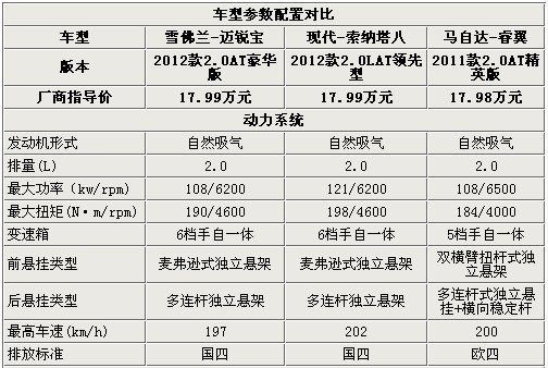 三款車雖然都是以運動外形示人,但從動力上來看,這三款17萬級別的車型配備的2.0L發(fā)動機的動力輸出都以家用為主。并不具備高調的馬力。在最大功率方面,索納塔以121Kw占取優(yōu)勢。而邁銳寶和睿翼相似的功率輸出則稍顯平庸。變速箱方面三款車同樣的都使用手自一體模式,檔位有所不同。懸掛方面,獨立懸掛的配備為三款車的運動型提供了保證。