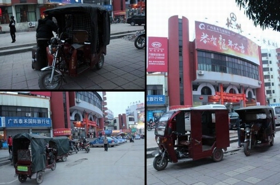 筆者在汽車總站門口看到,一輛與合法殘疾人車輛幾乎同樣大小的非法“綠皮”助力三輪車正與一輛合法的殘疾人營運車輛一起等客,因為其所在的位置較為優(yōu)越,外表與合法殘疾人車輛相似,一些外地來欽的旅客直接就選擇了違法助力三輪車。