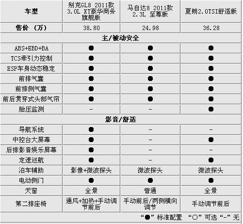 配置方面三車都裝備了電動(dòng)門,這點(diǎn)作為商務(wù)MPV來說很有必要,因?yàn)樵诟∫粋(gè)級(jí)別的MPV車型中也都有配置。MPV車型有載人多的特色,所以在主被動(dòng)安全方面三車都裝備的很齊全,保證安全性,夏朗還配置了胎壓監(jiān)測(cè)系統(tǒng),細(xì)節(jié)之處很用心。MPV寬大的車身對(duì)于泊車來說有些不便,但是三車都裝備倒車?yán)走_(dá),GL8還配置了倒車影像功能,但是夏朗雖然有屏幕但是并沒有配置倒車影像。全景天窗除過馬自達(dá)8都有配置,增加車內(nèi)成員的采光和開揚(yáng)感。