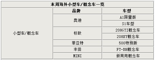 本周海外小型車型中以奧迪和標(biāo)致最為有特點,奧迪針對A1車型推出兩款車型,一款為A1 quattro Clubsport限量版,一款為奧迪S1車型。標(biāo)致則是公布了不同版本的208車型,雖然還處于概念車階段,不過其造型上已經(jīng)非常接近量產(chǎn)車型。菲亞特500C車型的特別版車型算是最為特別的,之前為法拉利打造過一款特殊車型;豐田則繼續(xù)公布之前曝光的FT-BH概念車;MINI全新的貨車正式曝光,并且將在日內(nèi)瓦車展上正式發(fā)布。