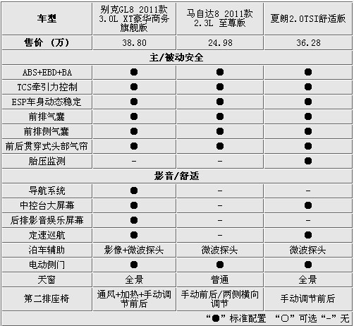 配置方面三車都裝備了電動門,這點(diǎn)作為商務(wù)MPV來說很有必要,因為在更小一個級別的MPV車 型中也都有配置。MPV車型有載人多的特色,所以在主被動安全方面三車都裝備的很齊全,保證安全性,夏朗還配置了胎壓監(jiān)測系統(tǒng),細(xì)節(jié)之處很用心。MPV寬 大的車身對于泊車來說有些不便,但是三車都裝備倒車?yán)走_(dá),GL8還配置了倒車影像功能,但是夏朗雖然有屏幕但是并沒有配置倒車影像。全景天窗除過馬自達(dá)8 都有配置,增加車內(nèi)成員的采光和開揚(yáng)感。