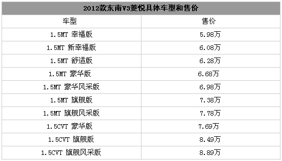 2012款東南V3菱悅于今日(3月1日)在廈門正式上市,新車共發(fā)布了10款車型,其中包括了3款CVT和7款手動擋的新車。同時本次新車主要是在外觀和配置上進行了升級,而車身的尺寸、軸距和發(fā)動機都將和現(xiàn)款基本相同。新車官方指導(dǎo)售價為5.98-8.89萬元,具體售價如下: