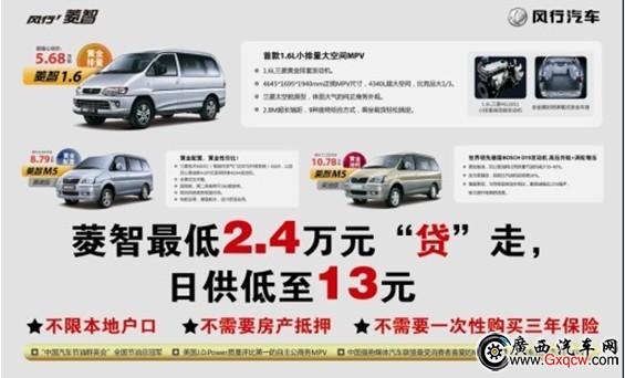 現(xiàn)在到秀廂大道南寧坤馳風(fēng)行4S店購(gòu)菱智,最低2.4萬(wàn)元貸走,日供低至13元。咨詢(xún)熱線:0771-5688996。