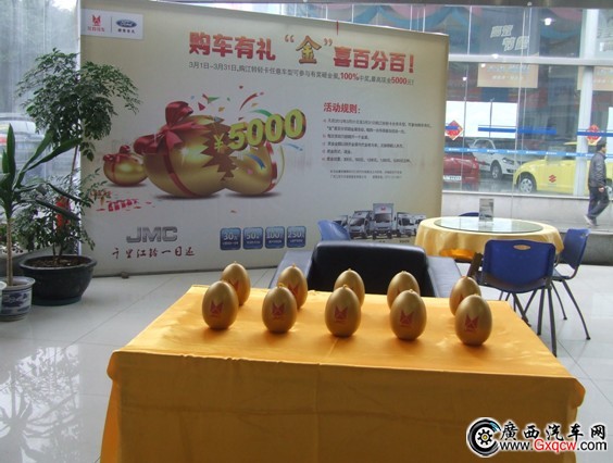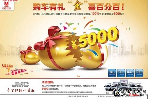 2012年3月,江鈴輕卡春季促銷活動(dòng)火熱進(jìn)行,購(gòu)車有禮 “金”喜百分百 購(gòu)江鈴輕卡參與有獎(jiǎng)砸金蛋,100%中獲,最高現(xiàn)金5000元!