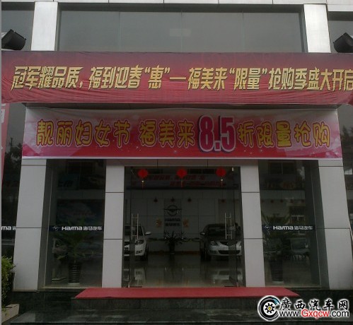 編輯從海馬?4S店了解到:3月8日當(dāng)天,海馬?4S店提供三八節(jié)福美來專場(chǎng)活動(dòng),為廣大女同胞們獻(xiàn)禮福美來尊享8.5折優(yōu)惠,僅限20臺(tái),到店還有精美禮品送出。數(shù)量有限歡迎搶購!詳詢:4922218,4885118 。