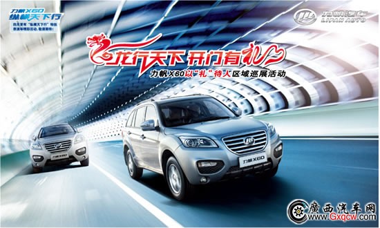 非凡的心激蕩著隨時啟程的情緒,讓我們一起體驗力帆X60帶給您龍行天下的豪邁。即日起至2012年3月日。力帆汽車城邀您光臨當(dāng)?shù)?S店,參與力帆X60品鑒有獎活動。多項好禮等著您!互動期間同時推出力帆320最低33500元氣,力帆620最低49800元起的驚喜禮遇。詳情咨詢當(dāng)?shù)亟?jīng)銷商!四月更有豪情激越的“縱橫天下行”特技表演等經(jīng);顒。敬請期待……