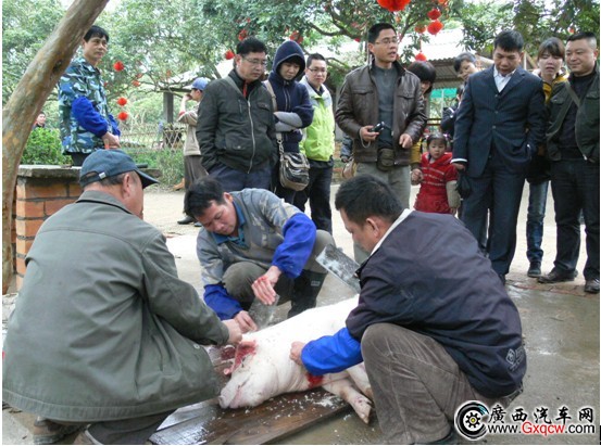 中午,農莊內工作人員現(xiàn)場為上海大眾車主展示了殺大豬全過程。對于生活在都市的人們說來,殺豬的過程基本是很難看到的,因為大都市中所吃到豬肉都來自肉聯(lián)廠,一般是看不到的,所以這個現(xiàn)場的展示吸引很多上海大眾車主的駐足觀看。