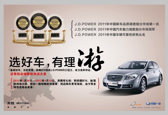 經(jīng)了解,奔騰B70喜獲2011年J.D POWER 中國新車品質(zhì)調(diào)查細分市場第一名!J.D POWER 汽車魅力指數(shù)細分市場冠軍!J.D POWER 中國車輛可靠性研究頭名!除了本次在2011年中國新車品質(zhì)調(diào)查中獲得細分市場第一,奔騰在J.D. Power榜單上頻頻獲獎,已然是J.D. Power的?汀T谌ツ晗奶旃嫉腏.D. Power亞太公司近期公布的2011年中國汽車銷售滿意度研究(SSI)總體排名中,一汽奔騰成為了唯一一個高于行業(yè)平均值的自主品牌企業(yè),位居自主品牌第一名。同時,J.D Power中國售后服務(wù)滿意度指數(shù)研究(CSI)中,一汽奔騰也獲得超出行業(yè)平均值的好成績。而在去年,一汽奔騰旗下的重磅車型奔騰B70,更曾榮膺J.D. Power2010年度中國新車質(zhì)量和汽車魅力指數(shù)該級別細分市場的雙冠王。