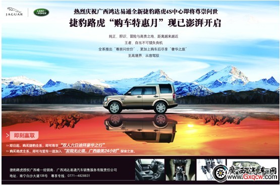 喜迎4S中心落成開(kāi)業(yè),廣西鴻達(dá)易通從即日起至3月31日舉行捷豹路虎“購(gòu)車特惠月”活動(dòng)。