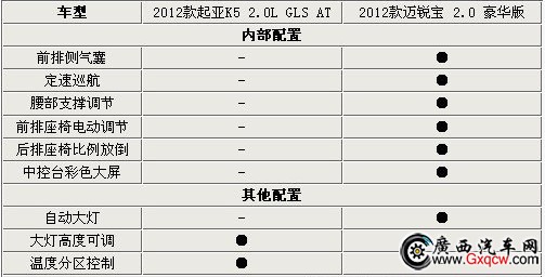 配置方面兩款車均具備天窗、倒車?yán)走_(dá)、真皮座椅等中級(jí)車常見配置,只是邁銳寶的配置相比起亞K5更加豐富,定速巡航、中控彩色大屏以及安吉星等高科技配置是起亞K5所不具備的。不過起亞K5的分區(qū)空調(diào)倒是這個(gè)價(jià)位中級(jí)車不多見的配置。