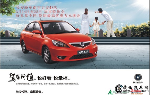 陽春三月,回饋客戶,長安轎車南寧萬友4S店將在3月24日至25日舉行悅翔周末特價會活動,多重豪禮等你拿,購悅翔車更是高達萬元現(xiàn)金優(yōu)惠,數(shù)量有限,欲購從速哦!