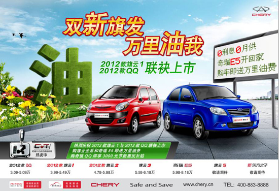 為慶祝奇瑞E5自動(dòng)擋(CVT)與2012款奇瑞QQ兩款新車聯(lián)袂上市,此次面向全國(guó)消費(fèi)者推出“雙‘新’旗發(fā) 萬里‘油’我”——購(gòu)車即送萬里油活動(dòng),為身處高油價(jià)背景下的車主帶來一場(chǎng)“及時(shí)雨”;顒(dòng)期間,購(gòu)買旗云1、2、3、奇瑞QQ(新款奇瑞QQ享受3000惠民補(bǔ)貼)、奇瑞E5中任一款車型,即可獲贈(zèng)1萬里加油費(fèi)用。