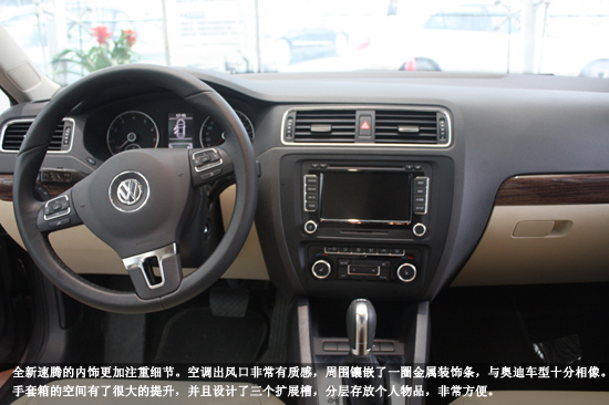 全新速騰標(biāo)準(zhǔn)化的方向盤能讓人第一時間聯(lián)想到這是一輛大眾車,儀表盤沿用了大圓套小圓的經(jīng)典設(shè)計(jì),延續(xù)了大眾汽車的實(shí)用作風(fēng)。全新速騰的方向盤依然選擇了三幅運(yùn)動造型,采用真皮包裹,握手處凸起設(shè)計(jì)恰到好處,握感舒適,也更顯動感。同時方向盤還具備了操控音響、接聽電話、或切換顯示信息等功能,安全駕駛更享便捷。