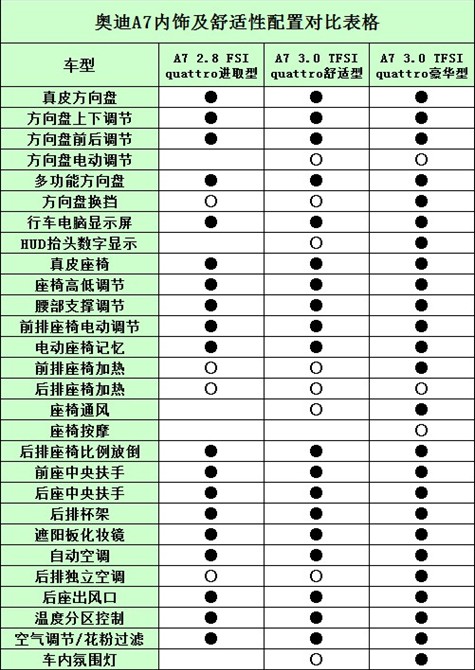 座椅方面,真皮座椅,座椅高低調(diào)節(jié),腰部支撐調(diào)節(jié)和電動調(diào)節(jié),電動記憶等功能是標配;而前排座椅加熱A7 3.0 TFSI 豪華型標配,其他車型選配;座椅通風(fēng)3.0 TFSI車型是標配,3.0TFSI舒適型是選配,后排座椅加熱則三款車型均可選配。
