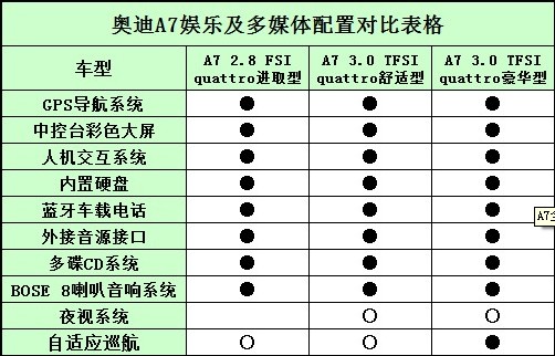 在娛樂和多媒體配置方面,A7頗有一視同仁的風(fēng)范,全部車型均配備了GPS,中央彩色大屏幕,MMI人車交互系統(tǒng),車載電話,多碟CD以及來自于BOSE的音響系統(tǒng),而更高級的B&O音響系統(tǒng)屬于選裝范圍。除了這些以外,A7 3.0TFSI車型可以選裝夜視系統(tǒng);自適應(yīng)巡航系統(tǒng)除了A7 3.0 TFSI 豪華型標(biāo)配此功能外,其他車型只能選裝。