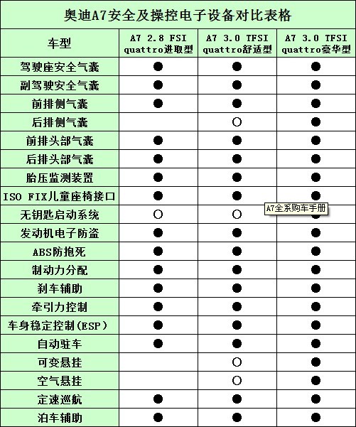 在安全方面,除了后排側(cè)氣囊,2.8FSI車型不具備,A7 3.0 TFSI 舒適型只能選裝外,其他的10個氣囊則是標(biāo)配。其他標(biāo)配的安全配置還包括胎壓監(jiān)測,ISO FIX兒童座椅接口,和發(fā)動機電子防盜等。在操控電子設(shè)備方面,從ABS到ESP再到電子駐車,泊車輔助基本都是標(biāo)配。而可變懸掛和空氣懸掛這兩個功能在A7 3.0 TFSI 豪華型上是標(biāo)配,A7 3.0 TFSI 舒適型可以選配,2.8FSI車型則不具備。