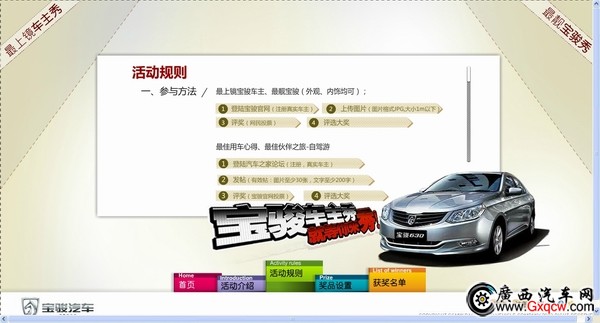最上鏡寶駿車主、最靚寶駿(外觀、內(nèi)飾均可) :登陸寶駿官網(wǎng)(注冊,真實(shí)車主)——>上傳圖片(圖片格式JPG,大小1m以下)——>評獎(網(wǎng)民投票)——>評選大獎