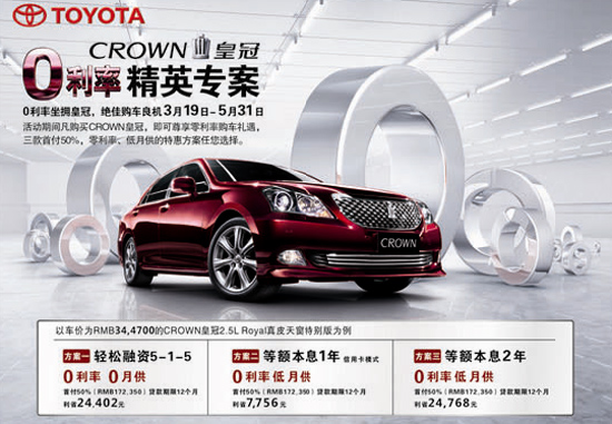 3月19日~5月31日活動期間,凡購買皇冠,即可尊享零利率購車禮遇,三款首付50%,零利率、低月供的特惠方案任您選擇。 |